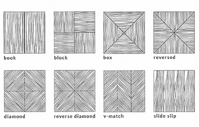 After the log is sliced, the stack of veneer leaves needs to be placed side by side to create veneer faces. The way in which the individual cuts are placed next to each other during fabrication of the veneer face can affect the overall look of the sheet.