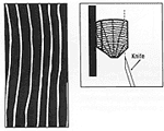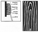 The way in which a log is cut in relation to the annual rings determines the appearance of the veneer.